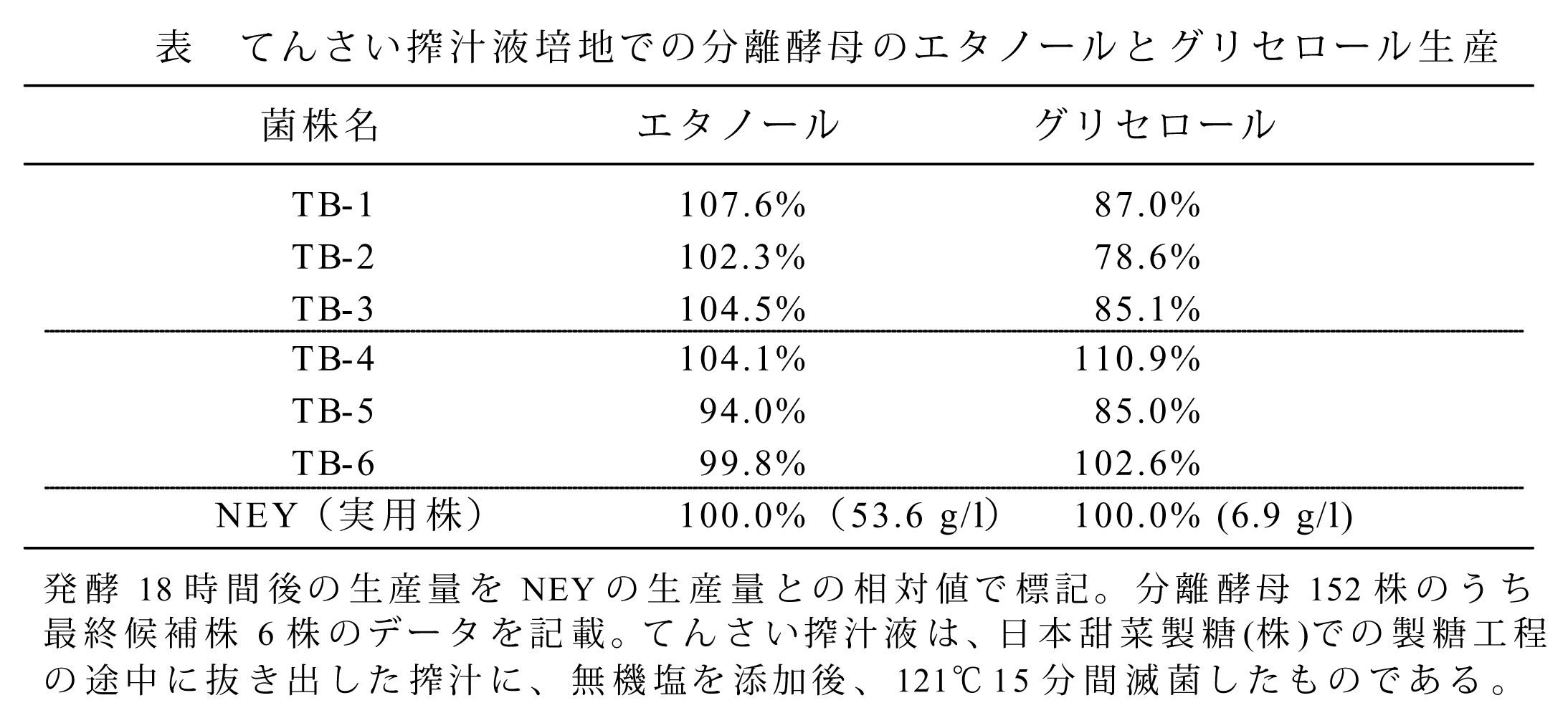 てんさい搾汁液を原料に高効率でバイオエタノールの生産が可能な酵母3株は、既存の実用酵母株と同等のエタノール生産能を有し、かつ、エタノール精製時の蒸留阻害要因であるグリセロールの生成量が実用株より少ない。
