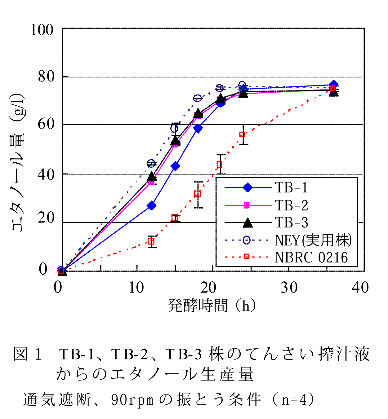 これら3株は、エタノール発酵用酵母の標準株であるNBRC 0216株と比べ、速やかにてんさい搾汁液からエタノールを生産する。また、実用株であるNEY株との比較では、発酵初期のエタノール生産量は若干下回るが、発酵36時間後の最終エタノール生産量は同等である(図1)。