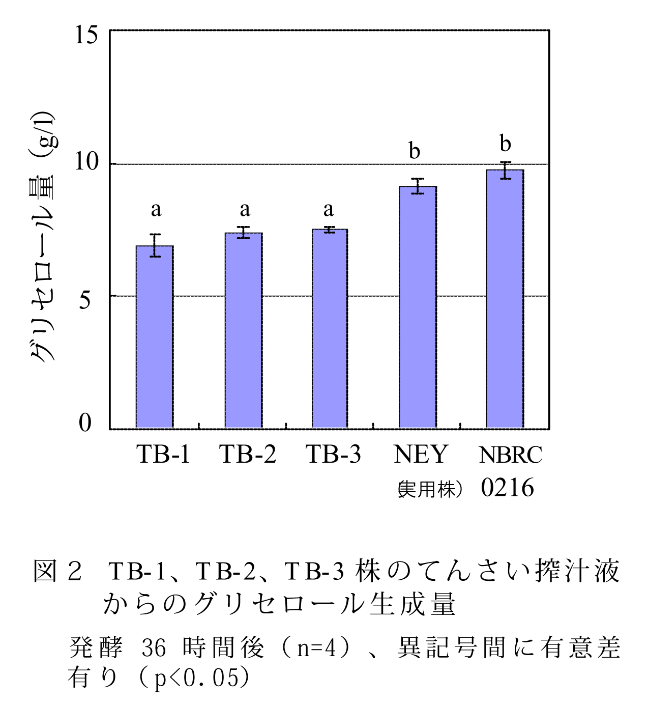 てんさい搾汁液からのエタノール精製時の蒸留阻害要因であるグリセロールの発酵36時間後の生成量は、3株ともバイオエタノール用標準株および実用株に比べ約20%少ない(図2)。