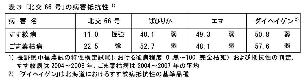 u–kŒð66†v‚ÍAnŠú‚ªg‘¶‚Ì‘h‚É‘®‚µA“¯nŠú‚Ì•iŽíu‚ς҂肩v‚Æ”ä‚×AŠ£•¨Žû—Ê‚âTDNŽû—ʂ͓¯’ö“x‚Å‚ ‚邪AŽ“•äŽû—Ê‚ª“¯“™ˆÈã‚ÅŽ“•ä’†‚ÌŽqŽÀŠ„‡‚ª‚‚¢B‚Ü‚½A‘Ï“|•š«‚ª‹‚A‹É‹ƒŒƒxƒ‹‚Ì‚·‚·–ä•a’ïR«‚ð—L‚·‚éB