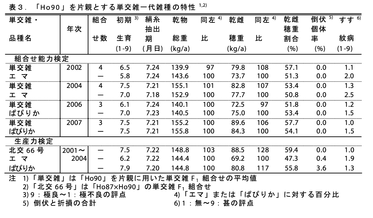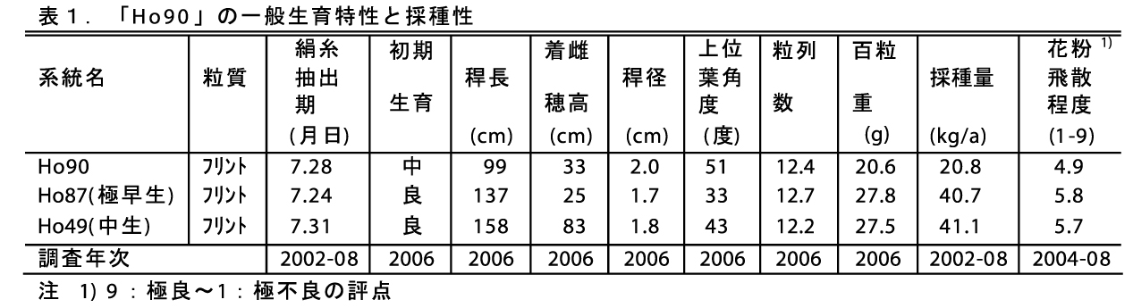 サイレージ用トウモロコシ一代雑種の親品種である自殖系統「Ho90」(エイチオーキュウジュウ)は、早生のフリント種で、組合せ能力が高く、耐倒伏性およびすす紋病抵抗性に優れ、一代雑種品種の親系統として利用できる。