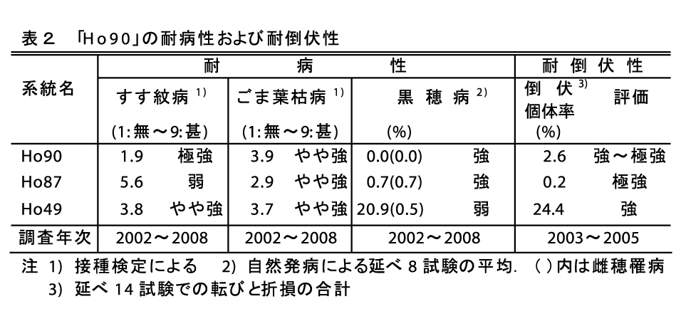 すす紋病抵抗性は“極強”、ごま葉枯病抵抗性は“やや強”、黒穂病抵抗性“強”である。耐倒伏性は“強〜極強”である(表2)。