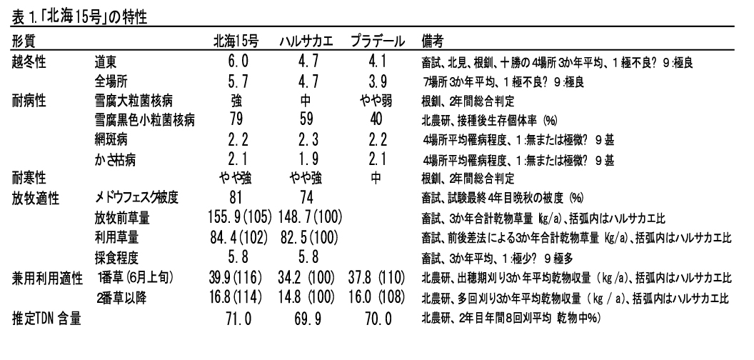 メドウフェスク「北海15号」は雪腐病抵抗性の向上に伴い、既存品種より越冬性が著しく改善されている。また短草・多回刈り乾物収量は「ハルサカエ」より7%多収で、とくに春季と秋季に優れる。北海道の土壌凍結地帯に適し、集約放牧に利用できる。