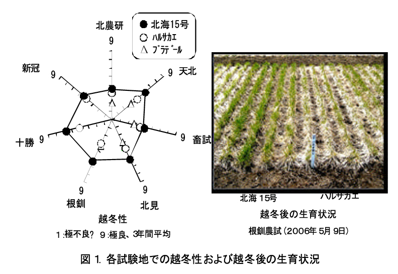 越冬性は、標準品種の「ハルサカエ」、比較品種の「プラデール」より顕著に優れる(表1、図1)。