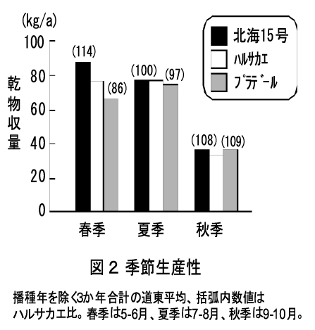 短草・多回刈り乾物収量は、「ハルサカエ」に比べ道東平均で7%多収で、季節別生産性は「ハルサカエ」より春季と秋季に優れる(表2、図2)。