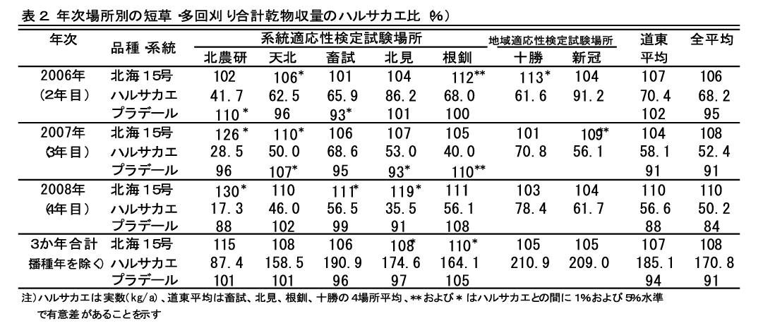 兼用利用での1番草および2番草以降の短草・多回刈り乾物収量は、「ハルサカエ」、「プラデール」より優れる(表1)。