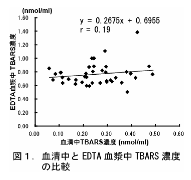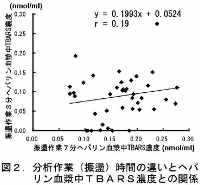 ホルスタイン種雌牛の血清と異なる血液抗凝固剤を含む血漿(ヘパリン血漿・EDTA血漿)中TBARS濃度の違いを比較検討すると、血清中TBARSは、EDTA血漿中の濃度と相関が見られない(図1)。血清やヘパリン血漿中TBARSはEDTA血漿中濃度に比べて極めて低い濃度である。ヘパリン血漿中TBARS濃度は、分析作業のひとつである振盪時間によって値が変動し、振盪時間の長短で相関は見られない(図2)。EDTA血漿中TBARS濃度は血清やヘパリン血漿に比べて、分析作業環境を限定できる。