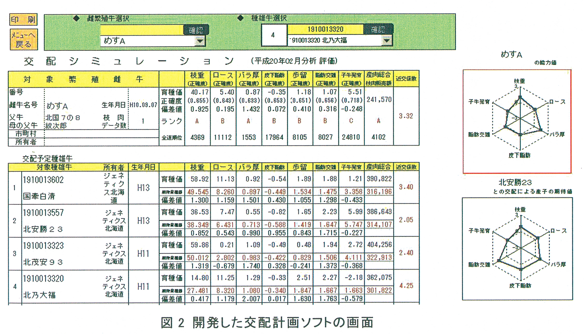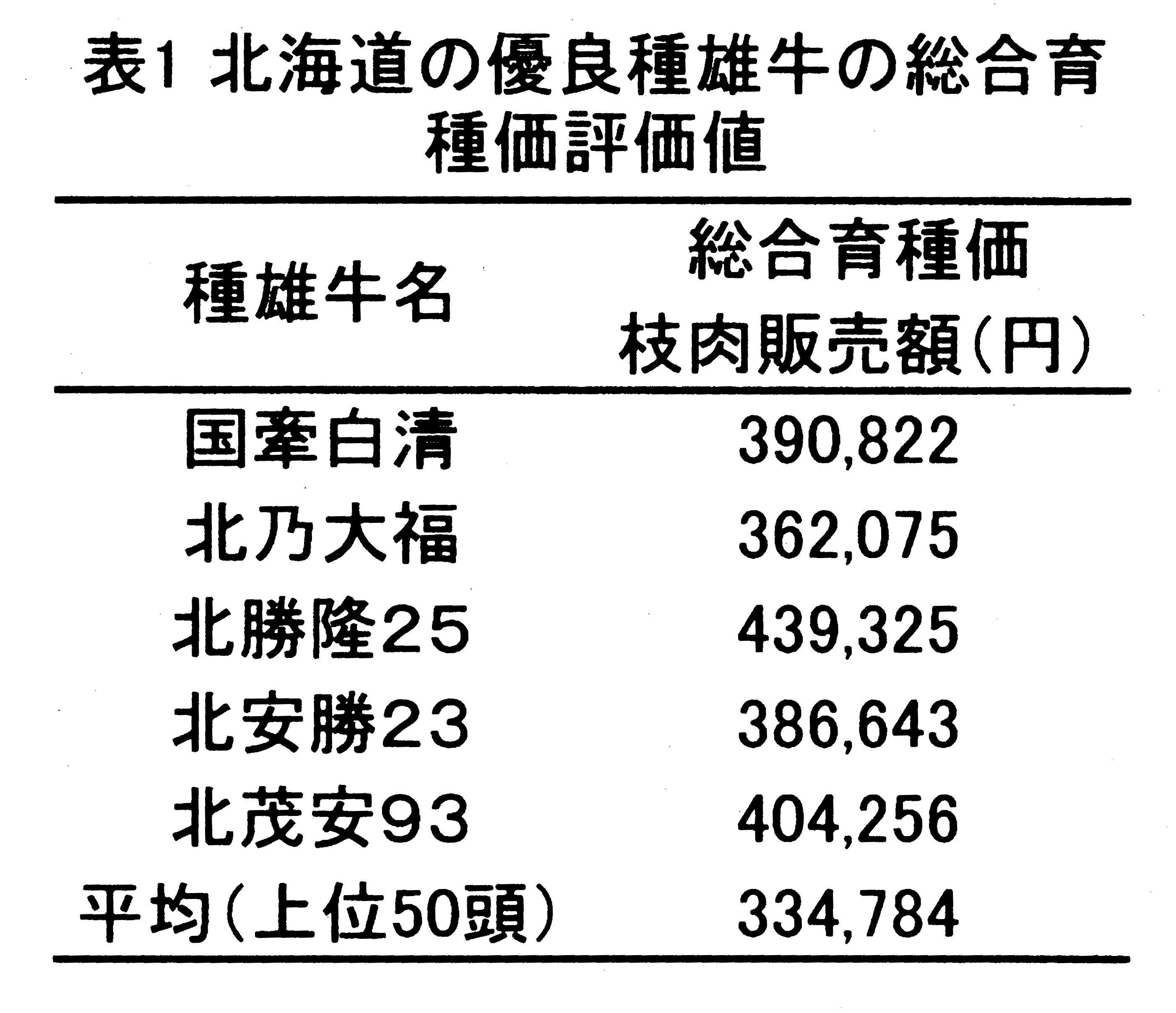 枝肉6形質の経済的重要度を加味した結果、産肉能力の総合育種価を算出する式は、次のように設定できる。「産肉能力の総合育種価(円)=1,992×枝肉重量の育種価(kg)+18,080×バラ厚の育種価(cm)+136,511×脂肪交雑の育種価(基準値)」。北海道の優良種雄牛の総合育種価評価値を表1に提示する。