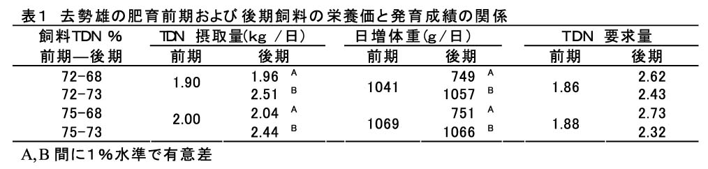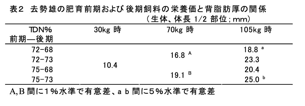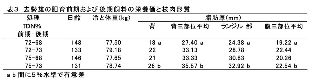 去勢雄の厚脂対策として、肥育前期飼料をCP17%、TDN75%からCP17%、TDN72%に、後期飼料をCP15%、TDN73%からCP15%、TDN68%に調整した飼料を給与することにより、肥育前期では発育速度を低下させず70kg時の背脂肪厚は2mm程度薄くでき、また、肥育後期では、発育は低下したものの、過度な脂肪蓄積を抑えることができる(表1、表2、表3)。