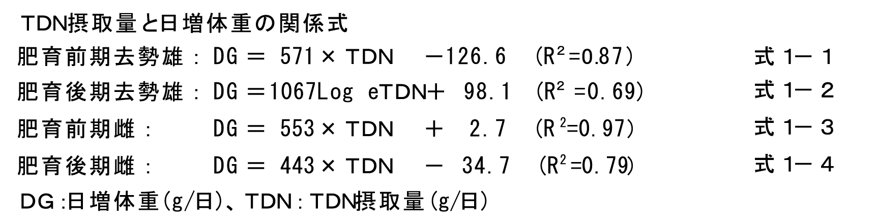 去勢雄および雌について、肥育前期(30〜105kg)および後期(70〜105kg)におけるTDN摂取量と日増体重の関係を示す(式1-1、1-2、1-3、1-4)。