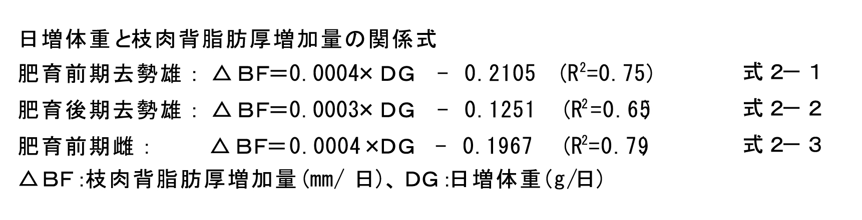 雌は、肥育前期の日増体重と枝肉脂肪厚の関係式(式2-1)から、肥育期に最大限の発育をさせた場合、肥育開始30kg時5mmの背脂肪厚は体重70kg時までに約8mm増加すると推定される。肥育後期は日増体重と枝肉脂肪厚の間に一定の関係はみられなかったが、平均約3mm増加し、と畜時の背脂肪厚は格付け「上」範囲の中間値程度の16mmとほぼ適正な値となる。