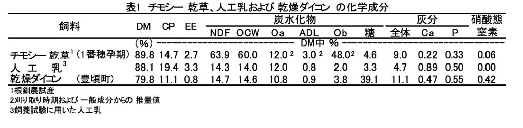 乾草は繊維含量が多く易発酵性炭水化物割合が少ない。人工乳は易発酵性炭水化物割合が多いが、繊維含量は少ない。乾燥ダイコンは人工乳の成分に近く、糖分は高い(表1)。