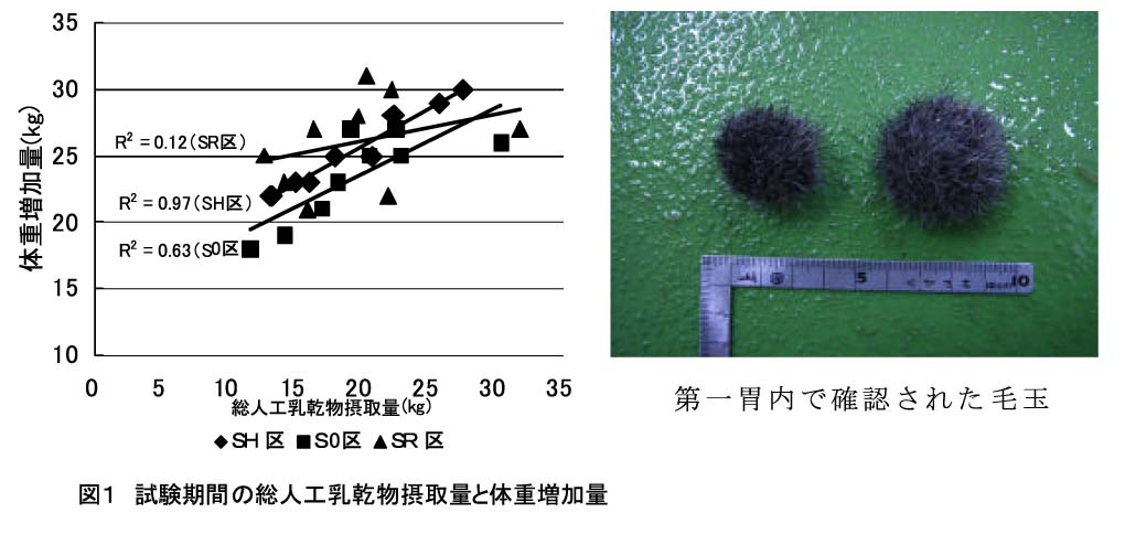 (SR区)は、SH区より物理的効果が少ない。S0区で第一胃内に毛玉(写真)や敷料、胃壁に飼料片の付着があることから、物理的効果のある粗飼料を給与する必要がある。