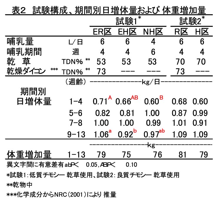 EH区)。良質乾草(TDN70%)に乾燥ダイコンを併給する効果はないが、いずれも9週齢以降の発育が良好となる(表2:R区・H区)。