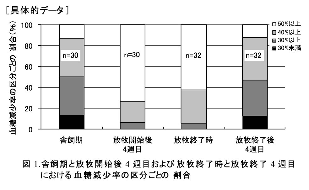 糖代謝能(インスリン感受性)は、放牧による4,000カウント(牛歩(コムテック)による測定)程度の歩行運動を4週間程度継続することで上昇し、放牧終了後4週間以内に低下する。