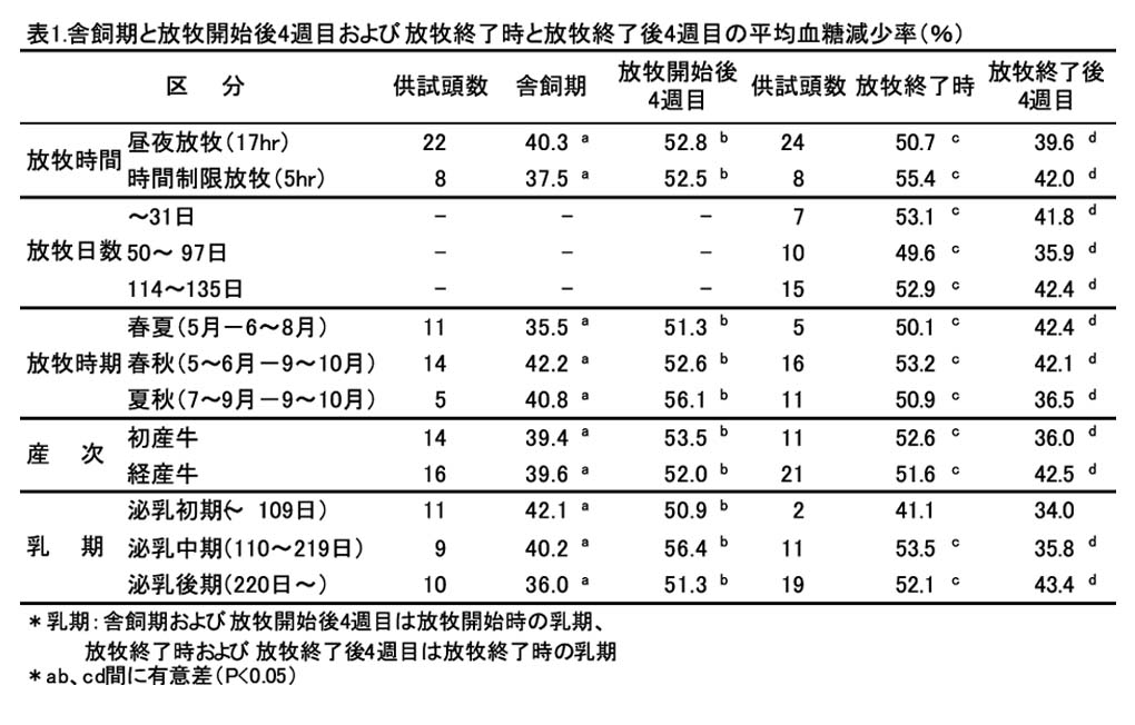 血糖減少率は、放牧時間(昼夜放牧、時間制限放牧)、放牧日数(32日未満、50〜97日、114〜135日)、放牧時期(春夏、春秋、夏秋)、産次(初産、経産)および乳期(泌乳前期、中期、後期)に関わらず、放牧開始後4週目に、舎飼期と比較して有意に高く(P<0.05)、放牧終了後4週目に、放牧終了時と比較して有意に低い(P<0.05)(表1)。これらのことから、糖代謝能は、5時間程度の時間制限放牧でも放牧開始後4週目には上昇し、放牧終了後4週間以内に低下するものと考えられる。