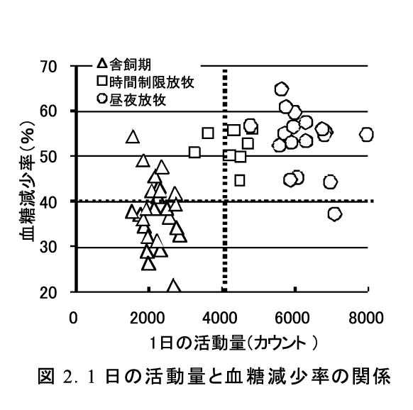 放牧時間に関わらず、1日の活動量が4,000カウントを超えた供試牛のほとんどで放牧開始後4週目の血糖減少率は40%以上である(図2)。血糖減少率を40%以上に保つには、4,000カウント程度の歩行運動を4週間程度継続することが必要と考えられる。