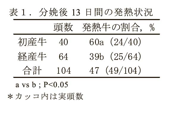 分娩後13日間に初産牛は60%、経産牛は39%の牛で発熱する(表1)。発熱牛群の体温推移は分娩後3日目に最高体温を示す。定期的な体温測定により、発熱牛の約70%を分娩後4日目までに検出することが可能である。