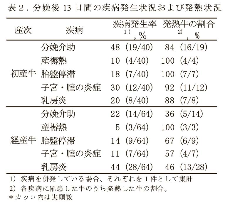 分娩介助を行なった初産牛は発熱する割合が84%と有意に高い。また初産牛では胎盤停滞および子宮・腟の炎症を発症した牛のほとんどが発熱する(表2)。