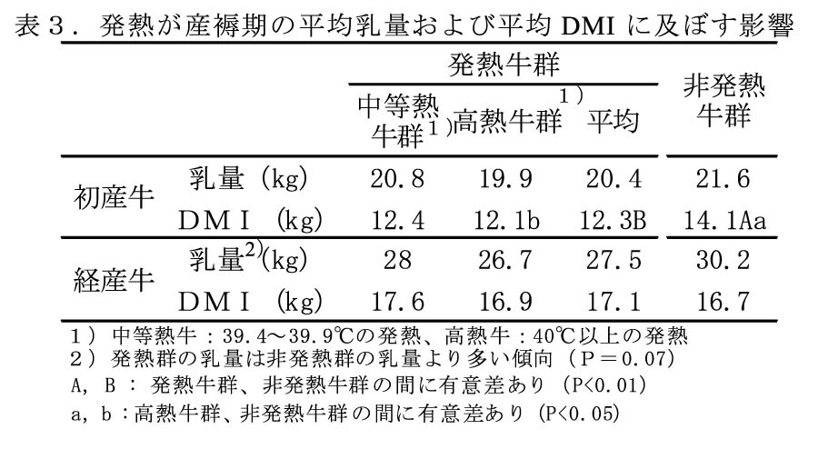 「乳牛の産褥期における発熱と乳量・飼料摂取量および疾病発生との関係」(指導参考)[具体的データ]