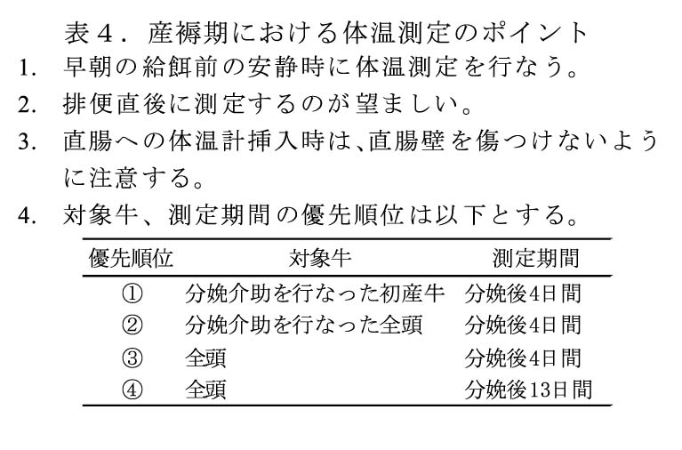 分娩後の発熱は疾病発生に大きく関係し、また乳量および乾物摂取量に影響を与えるため、分娩後13日間は体温測定を行なうことが望ましい。特に分娩介助を行なった初産牛は必ず体温測定を行なう必要がある。