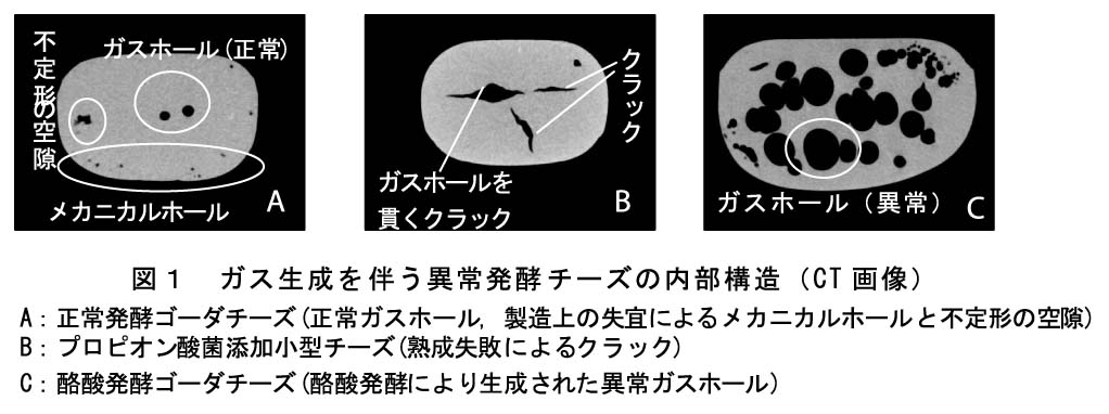 ガス生成を伴う異常発酵チーズでは、多様な形のメカニカルホール、クラック等が形成されチーズ内部に不均一に分布している(図1)。