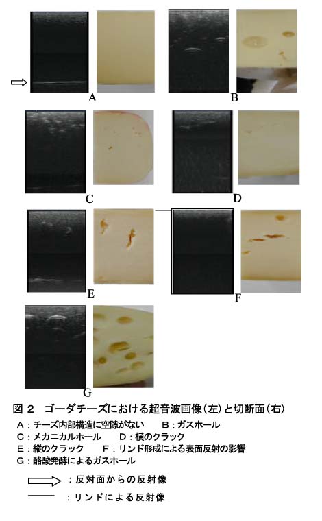 超音波画像により、表面の乾燥のみにとどまっているチーズでは、ガスホール、メカニカルホールおよび超音波の入射方向と直交するクラック(亀裂)が識別できる(図2B、C、D)。しかし、入射方向と平行するクラックはメカニカルホールとの判別が困難である(図2E)。また、リンド(表皮)が形成されたチーズにおいては、本法による内部観察は難しい(図2F)。