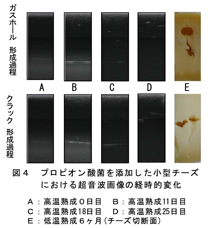 超音波画像による熟成中チーズの経時的観察により、種々の空隙形成過程が確認できる(図4)。