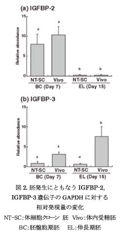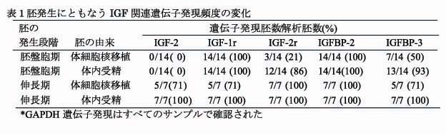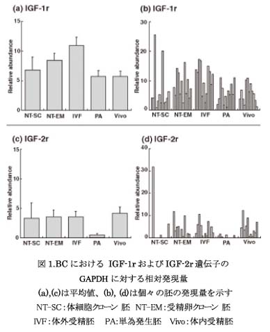 体細胞クローン胚のIGF-1r、IGF-2r遺伝子発現において個々の胚での発現量のバラツキが大きい。(図1)。また、体細胞クローン胚および体内受精胚の胚盤胞期および伸長期においてIGF-2rおよびIGFBP-3遺伝子の発現頻度が胚発生に伴い高くなる。IGFBP-2遺伝子は体細胞クローン胚と体内受精胚いずれも伸長期において発現量が急激に減少するが、両者の間に差はない。IGFBP-3遺伝子は、体内受精胚では伸長期に発現量が有意に増加するが、体細胞クローン胚では発現量の増加が認められない。(図2)。