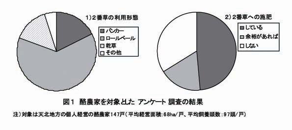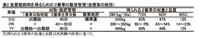 良質粗飼料としての2番草の生産に資するため、現場における2番草の利用・飼料成分等の実態および栽培管理が収量・品質に及ぼす影響を明らかにし、その問題点と改善策を示す。