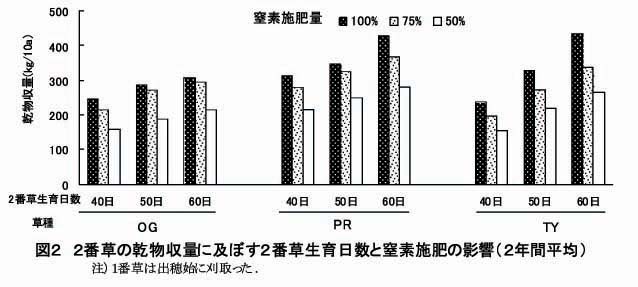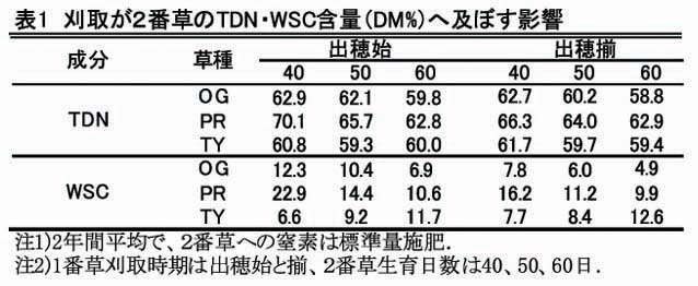 これらから、1番草の刈取時期をOG、PRが出穂始でTYは出穂始〜出穂期、2番草の生育日数をOGが40日、PRが40〜50日、TYが60日とし、窒素を標準量施肥することにより、本試験で設定したWSCを含めた良質牧草としての2番草を概ね得られる(表2)。