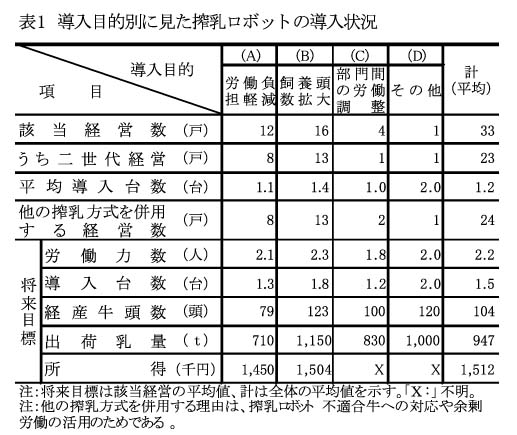 33戸の概況調査から搾乳ロボットの導入目的を区分すると、(A)労働負担軽減、(B)飼養頭数拡大、(C)部門間の労働調整、(D)その他の4タイプがみられ、特に(A)、(B)タイプが多い。導入経営は二世代経営が全体の70%(23戸)、また導入形態は他の搾乳方式を併用する場合が70%(24戸)を占めている。導入経営平均で出荷乳量947t、所得1,512万円が目標とされている(表1)。