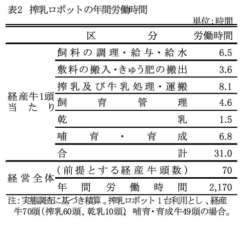 5戸の実態調査から搾乳ロボット導入に伴う労働の変化を解析すると、ア)労働力1人当たり飼養管理労働時間が1,800時間以下へ短縮、イ)パソコン操作など管理労働の割合が7.2〜21.2%へ増加、ウ)搾乳作業における組作業の解消、エ)作業時間帯の設定の柔軟化がみられる。搾乳ロボット1台を利用し、経産牛70頭と哺育・育成牛49頭を飼養する場合の年間労働時間は2,170時間であり(表2)、労働力1人で対応できる水準である。