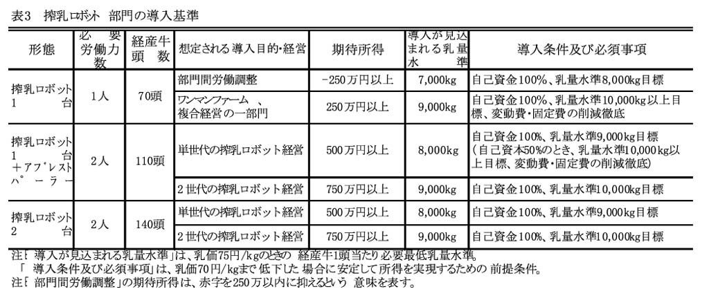 搾乳ロボットの導入形態別に経済的な導入基準を示す(表3)。二世代経営で所得750万円以上を実現する場合は、搾乳ロボットとアブレストパーラーの併用、もしくは搾乳ロボット2台の導入が必要である。乳価75円/kgの場合、経産牛1頭あたり乳量を9,000kg、乳価が70円/kgまで低下した場合は、経産牛1頭当たり乳量10,000kg以上が必要である。