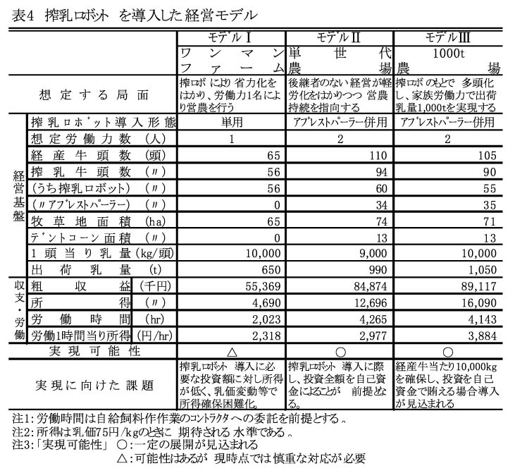 経済的な導入基準に基づき、3つの経営モデルを策定する(表4)。モデルTは搾乳ロボット単用とし、省力化を図り労働力1人で営農する「ワンマンファーム」、モデルUは搾乳ロボットとアブレストパーラーを併用し、後継者のない経営が軽労化を図りつつ営農を持続する「単世代農場」、モデルVは搾乳ロボットとアブレストパーラーを併用し、多頭化し家族労働力で出荷乳量1,000tを実現する「1000t農場」である。このうち、モデルVが二世代の持続的な経営モデルである。