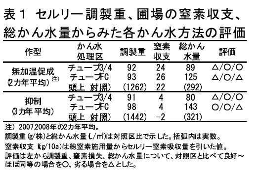 調製重(調製後の1株重)、窒素収支、総かん水量からみると、無加温促成作型ではチューブ3/4区(1回当たりかん水量が圃場容水量(pF1.5相当)の3/4量)、抑制作型ではチューブFC区(同圃場容水量)が適切なチューブかん水法と判断される(表1)。また、チューブかん水区での調製重低下には生育初期の株元の土壌水分不足の影響が疑われる。