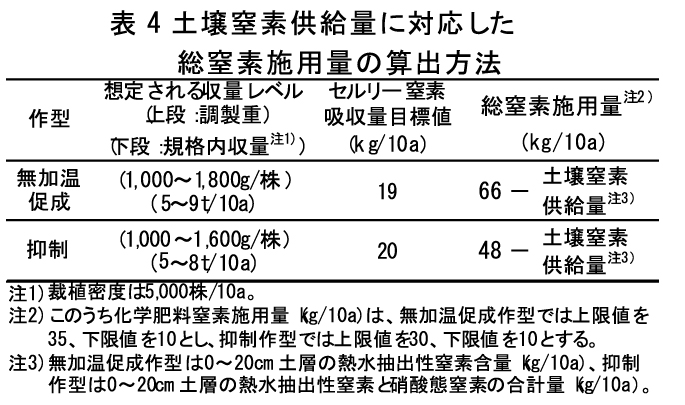 セルリーは窒素施肥に対する反応が緩慢なため、十分な調製重を得るためには土壌窒素肥沃度を高めるとともに、化学肥料窒素施用量を適正範囲とすることが重要である(データ省略)。調製重は窒素吸収量と有意な正の相関を示し、その窒素吸収量は合計窒素供給量(総窒素施用量+土壌窒素供給量)と密接に関連することから、土壌窒素供給量に対応した総窒素施用量ならびに化学肥料窒素施用量の上・下限値を設定した(表4)。