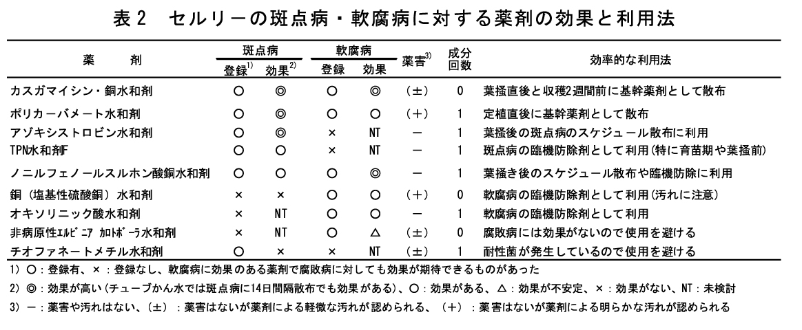 Pseudomonas marginalis pv. marginalisによる腐敗病が発生しており、軟腐病と混発している。軟腐病に対して薬剤ごとに効果に違いがあり(表2)、腐敗病(未登録ではあるが)に対しても効果が期待できるものがある。