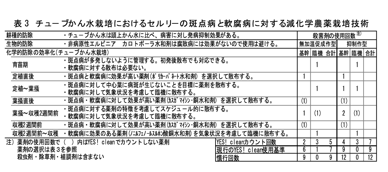チューブかん水栽培において、複数病害への同時防除、斑点病での被害許容水準(発病度で25)、定植時や葉掻時の薬剤防除の必要性、栽培期間を通した効率的な薬剤散布方法を明らかにし、病害に対する減化学農薬栽培技術を作成した(表3)。