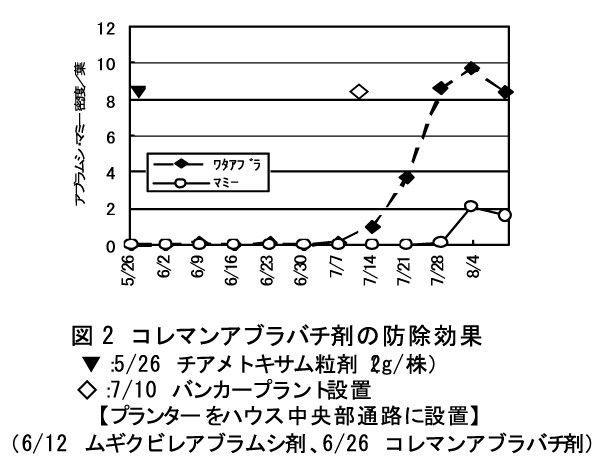 ワタアブラムシ(図2):1)定植時にチアメトキサム粒剤(2g/株)を処理する。2)プランターにバンカープラント(秋まき小麦)を栽培し予めムギクビレアブラムシとコレマンアブラバチを十分に増殖させておく。3)定植4週間後にプランターをハウス内中央通路に約10m毎に1個を設置する。4)ワタアブラムシの増殖が止まらず、すす症状などが認められる場合はピメトロジン水和剤(3000倍)を散布する。