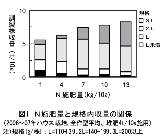 場内ハウスのN増肥による増収効果は、堆肥4t/10a施用の条件で、N施肥量13kg/10a(総N施用量15kg/10a)まで認められる(図1)。総N施用量が12kg/10aでL規格以上の調製株を8割以上得ることができ、基準の範囲内で安定的な生産が行える。