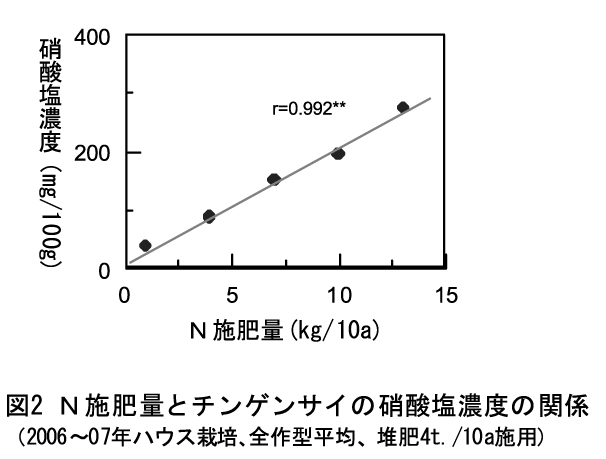 ハウス栽培における増収効果は総N施用量15kg/10aまで認められるが、Nの増肥と共に調製株の硝酸塩濃度が高まることや(図2)、作物に利用されなかった余剰Nが増えることから、総N施用量の上限は15kg/10aが妥当である。露地栽培についても、ハウス栽培と同程度に余剰Nが増えることから、総N施用量の上限は15kg/10aとする。