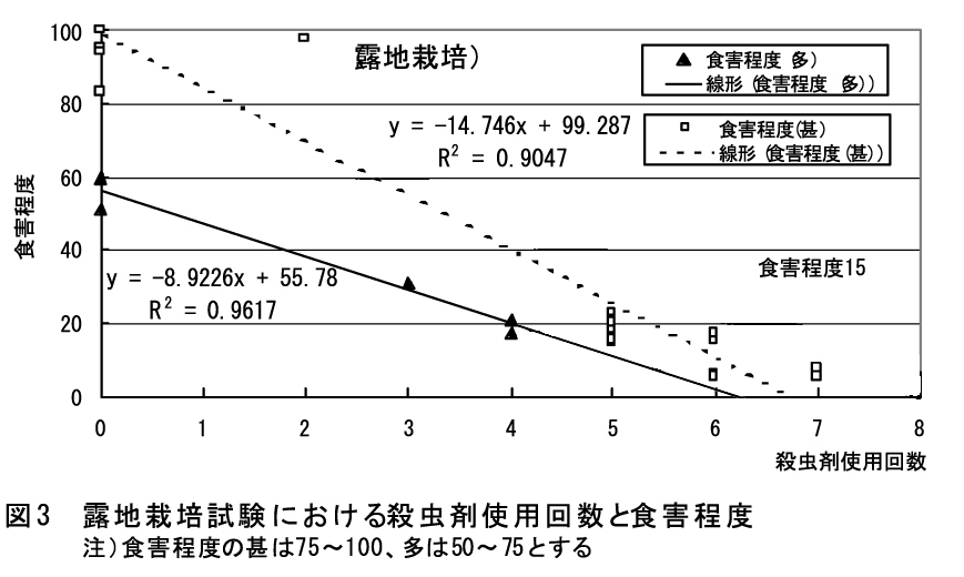 殺虫剤の使用基準は、ハウス栽培では現行基準で対応可能であるが、露地栽培では5〜6回要する場合があり(図3)、5回とすることが妥当である。