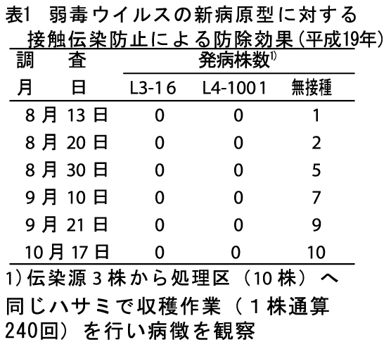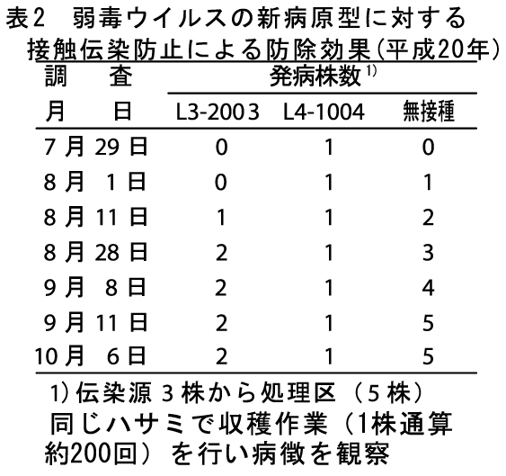 北海道で主に栽培されているピーマン品種「みおぎ」においてL3-16弱毒株、L4-1001弱毒株の新病原型による接触伝染防止への防除効果は高い(表1)。それに対しL3-2003弱毒株、L4-1004弱毒株の新病原型による接触伝染防止への防除効果はやや低い(表2)。