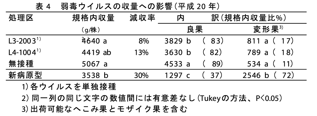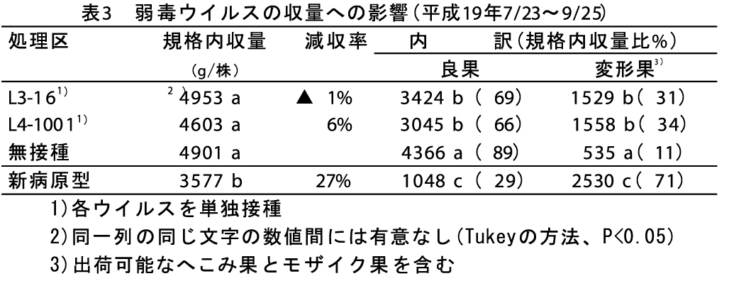 L3-16弱毒株、L4-1001弱毒株の収量への影響は収量や草丈の低下は認められない(表3)。しかし、へこみ果(果実が軽く変形)の発生は両弱毒接種区で規格内収量の約30%と無接種に比較して多くなる。また、夜温が10℃以下となる9月末以降、収量の低下が認められる。新病原型接種区では27%の減収率となり、モザイク果とへこみ果をあわせた変形果の発生は規格内収量の71%に達する。