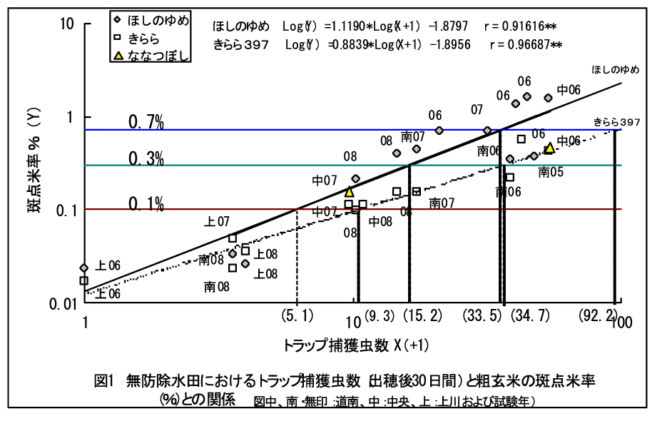 本カメムシの要防除水準は、出穂後30日間の水田トラップ捕獲虫数と斑点米率の関係から設定される(図1)。この積算虫数を1日当たりに換算し、防除間隔の7日間で積算した値を防除要否の基準とする(表1)。斑点米率0.1%以下(1等米)に抑えるには、7日間の捕獲虫数が「ほしのゆめ」ではトラップあたり1.2頭、「きらら397」で同2.2頭が防除要否の目安となる。