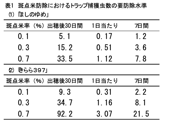 斑点米率0.1%以下にするための7日間のトラップ捕獲虫数の防除要否の基準に従って追加防除を行うと、「ほしのゆめ」および「きらら397」で斑点米率が0.1%となり(表2)、防除への適用性が確認できた。