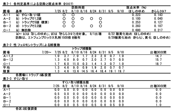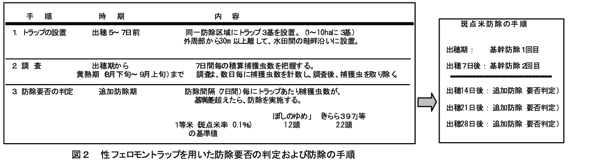 性フェロモントラップによる要防除水準は、各地区の防除組合および各農家が実施する斑点米防除に活用する。