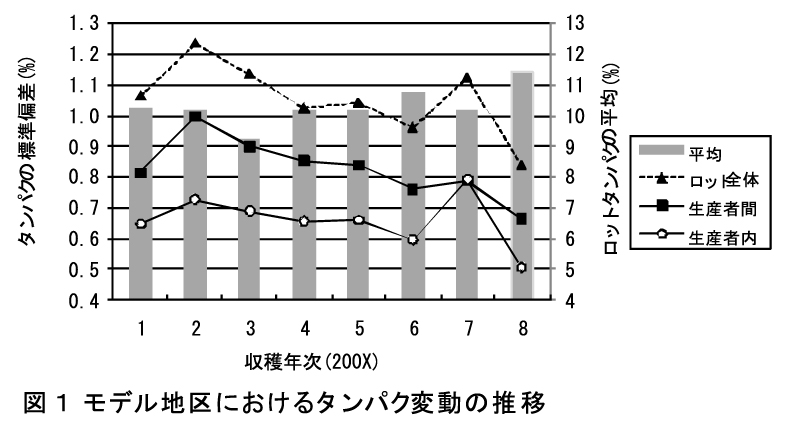 全道の品質評価およびモデル地区の集荷段階におけるロット別タンパクの変動は、年次間差とJA間あるいは生産者間差が有意であり、概ね両者の相加的なモデルが成り立つものの、交互作用も有意であり、年次によるタンパクの変動パターンはJAあるいは生産者でやや異なるものと考えられる(データ省略)。
