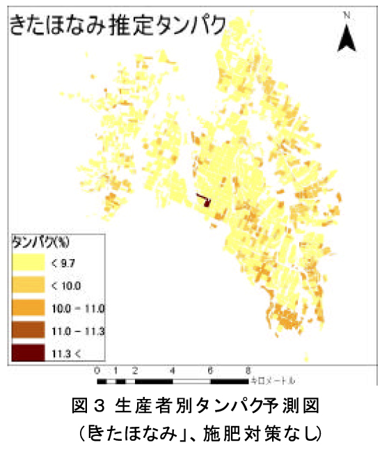 (n=170、r=0.902***、RMSE=0.495)の回帰式で推定でき、新品種「きたほなみ」に置き換えた場合の推定タンパクマップを作成すれば、生産者毎に新たな後期追肥の必要性を大まかに予察できる(図3)。